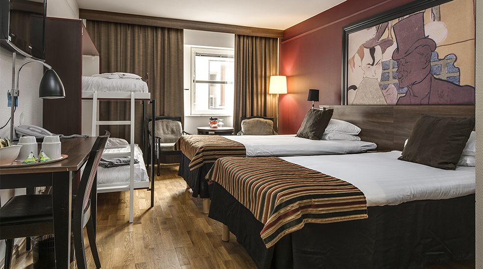 Vores familieværelser har god plads til hele familien. Værelserne er møbleret med to senge på 105 cm samt en køjeseng, hvor der er plads til to personer. Bookes værelse til 3 personer, kan en anden værelseskategori tildeles.